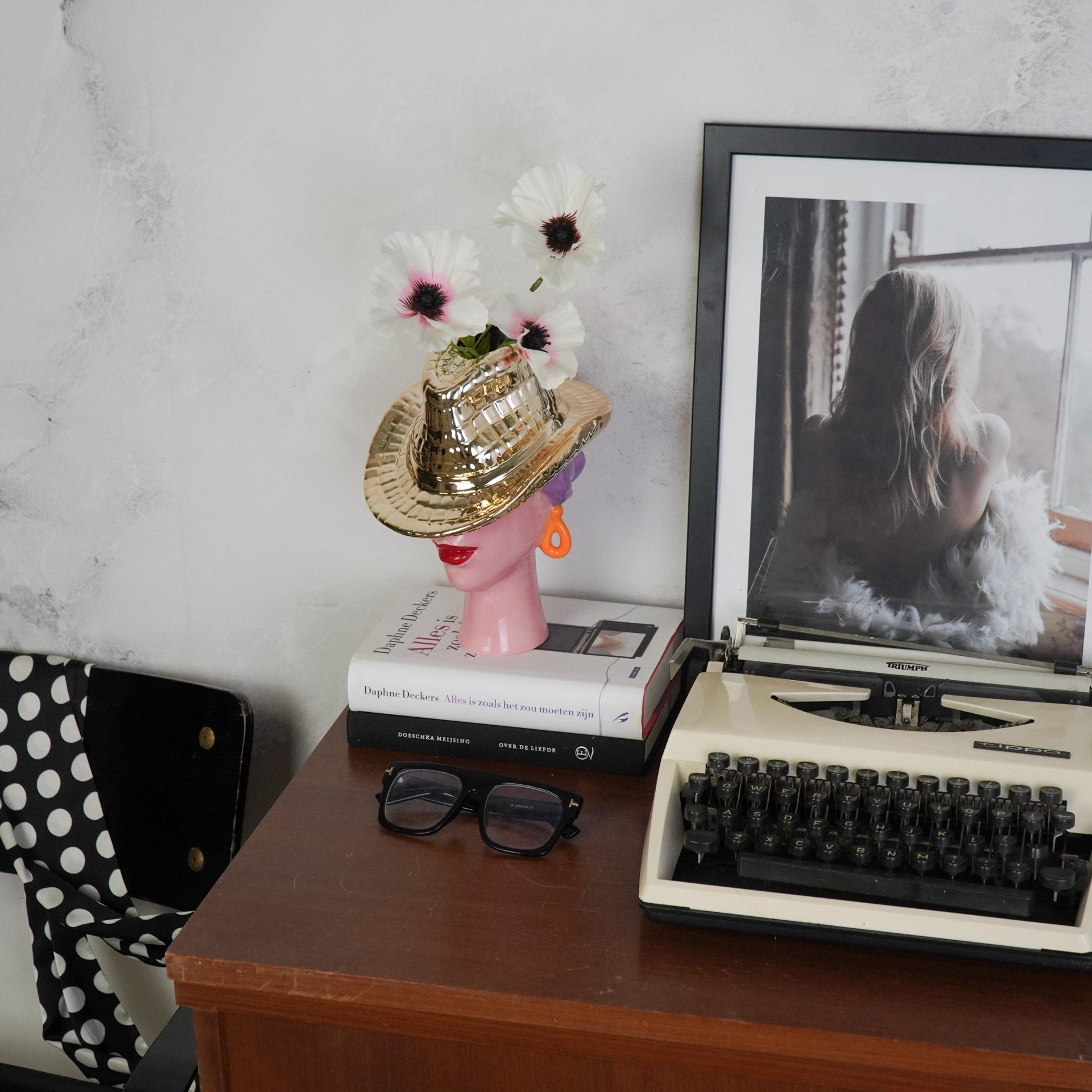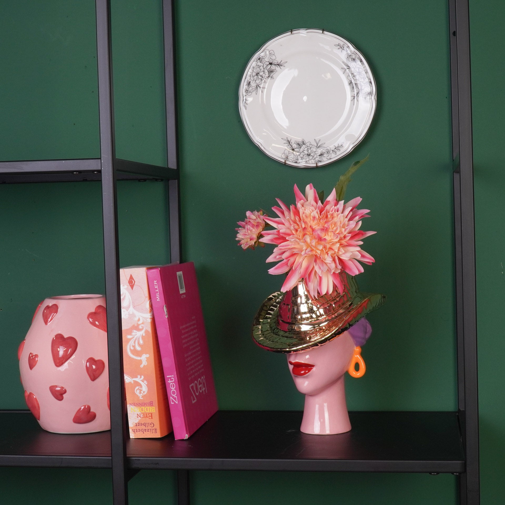 LADY WITH THE HAT – A touch of western chic for your interior! This ceramic vase in the shape of a woman with a cowboy hat in lilac and gold (19x16x23.5 cm) is a true eye-catcher. This lady vase combines artistic design with a bold, feminine touch. The subtle lilac shade combined with the sparkling gold makes this vase a stylish statement piece that makes your flowers shine even brighter.