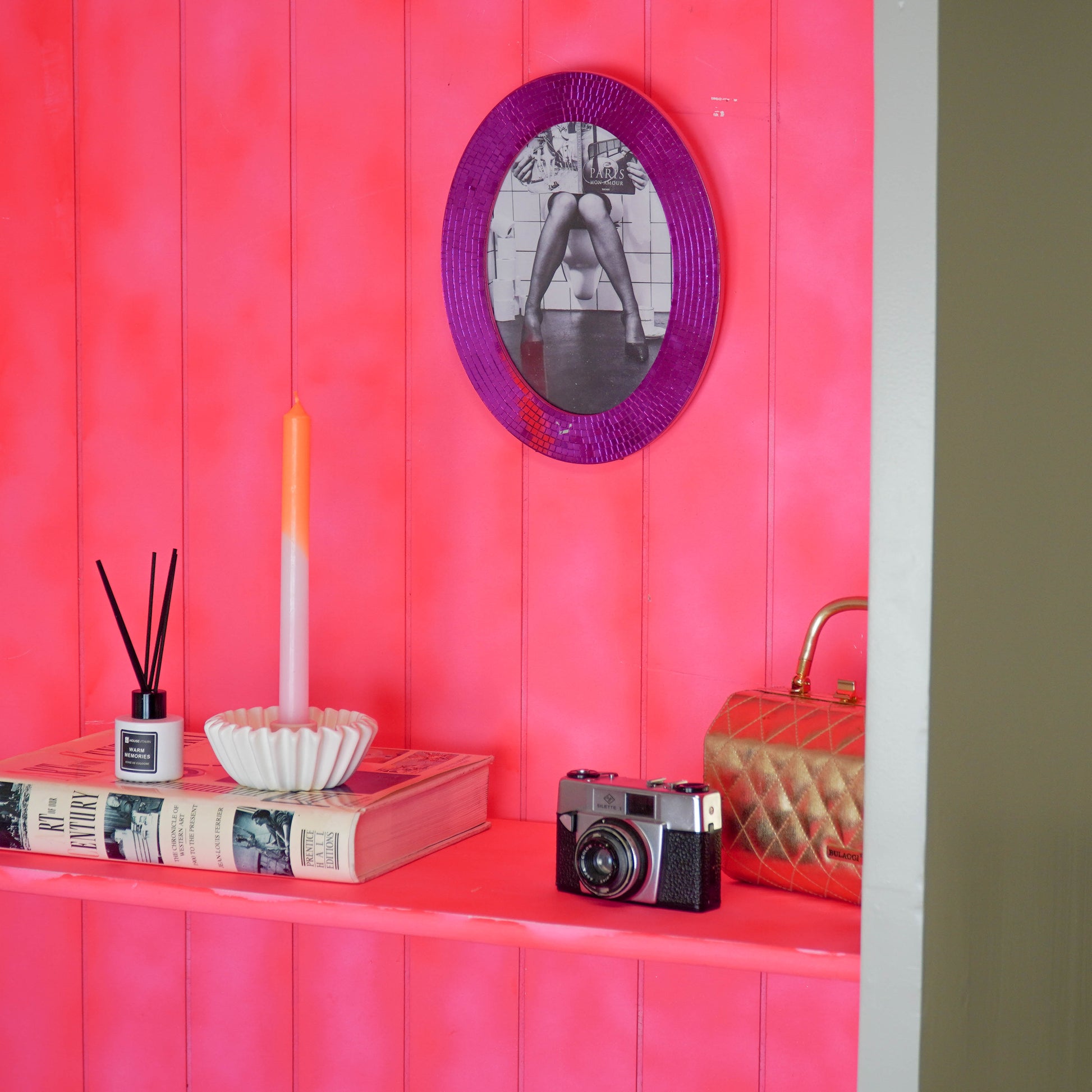 DISCO PHOTO FRAME – Add glamour and playfulness to your interior with this pink photo frame adorned with disco stones. The sparkling edge of tiny mirror tiles beautifully catches the light, giving any room a cheerful, luxurious look. Perfect as an eye-catching feature in your hallway, bedroom, bathroom, or dressing room.