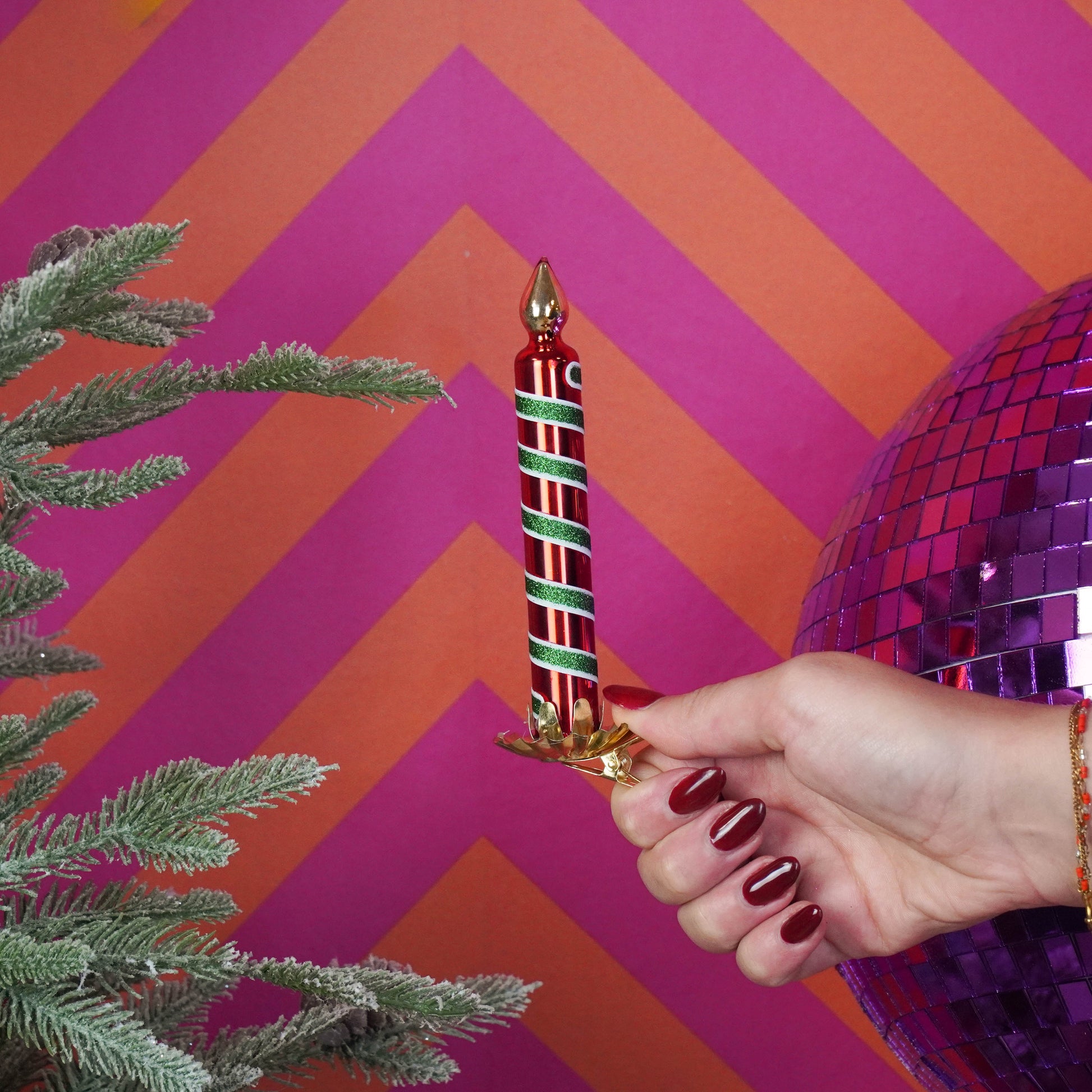 SHINE A LIGHT ON ME – A touch of old-fashioned Christmas charm with a sparkling twist! This glass clip-on candle is a stylish nod to the classic Christmas trees of the past. With its deep red candle, green holder, and subtle shine, it brings warmth, tradition, and a festive glow to your holiday décor.